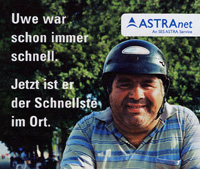 | Dass der Uwe außergewöhnlich schnell sein kann hat selbst die Werbung festgestellt. Deshalb kann man ihn nun in einer Broschüre für einen Internetprovider entdecken (das Bild mit dem Text ist original und garantiert nicht verändert!): |