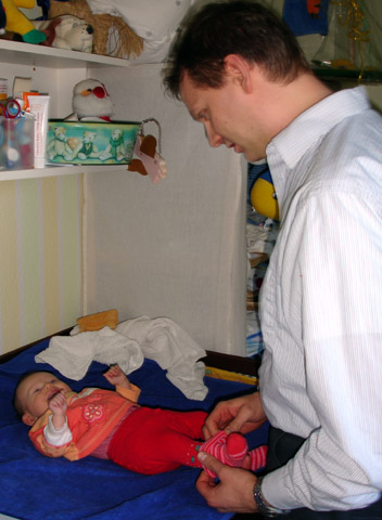 Hier sieht man meinen Onkel, der es sich nicht nehmen ließ mich zu wickeln. Da wir noch ganz am Anfang sind habe ich auch gut lachen.